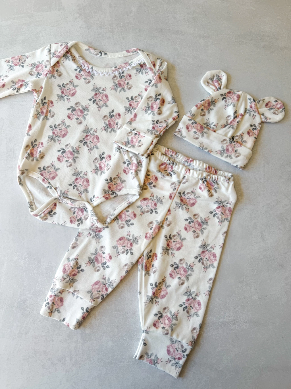 El pantalón cuenta con puños y elástico en la cintura, asegurando un ajuste perfecto sin perder suavidad ni libertad de movimiento. Además, el gorrito con orejitas añade un detalle adorable que completa el look.