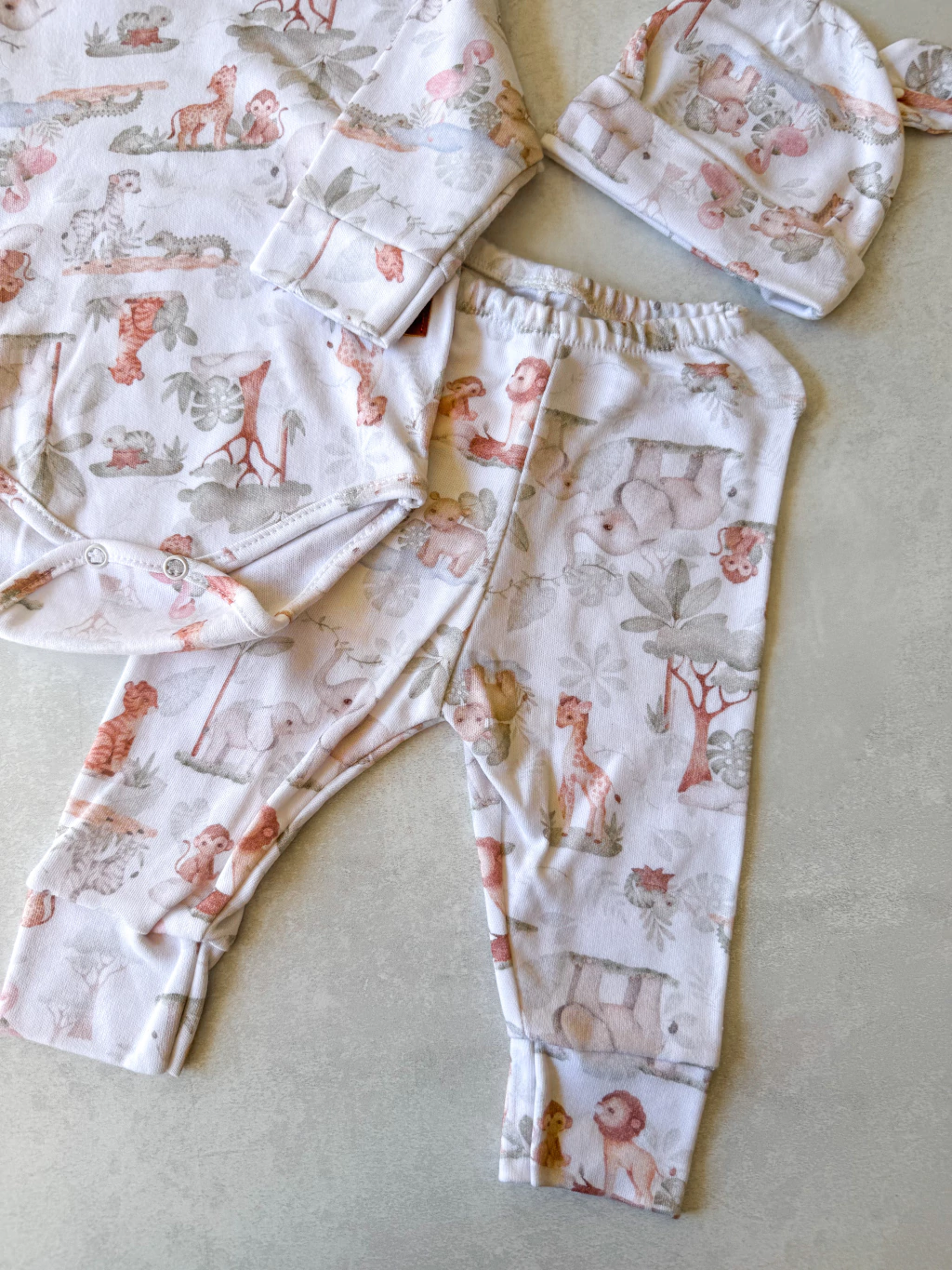 Confeccionado en algodón premium, este conjunto es ideal para cuidar la delicada piel de tu bebé, ofreciendo suavidad y durabilidad. El estampado con animalitos de la selva aporta un toque tierno y divertido, perfecto para cualquier ocasión.